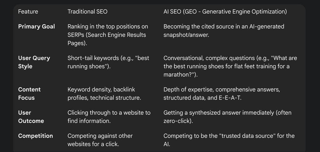 Traditional SEO optimizes for a ranking algorithm based on signals. AI SEO optimizes for a Large Language Model based on comprehension and trust.