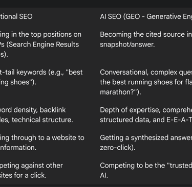 There is a misconception that if you do good traditional SEO, you automatically win at AI SEO. While there is overlap-technical health and great content still matter-the objective has changed.